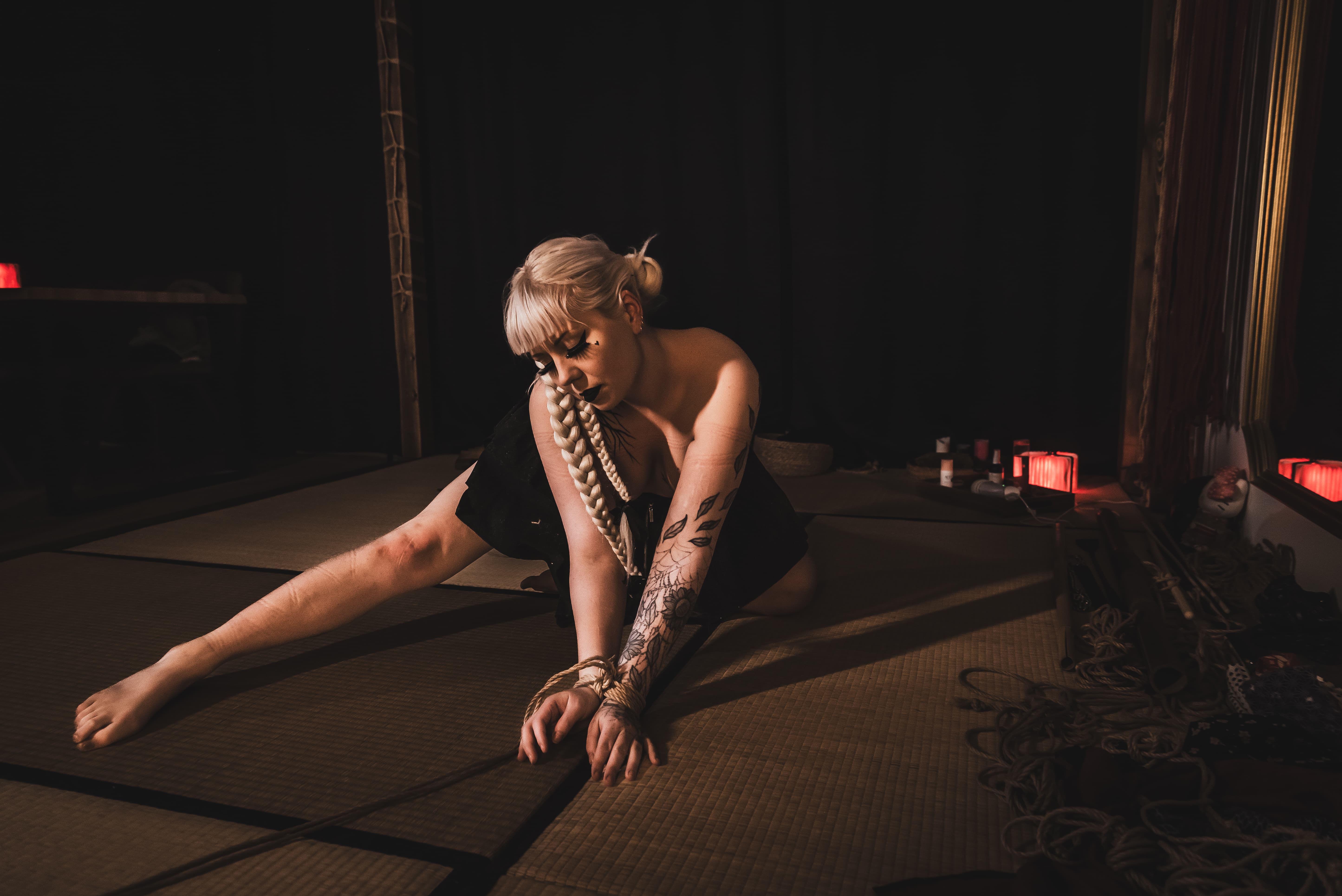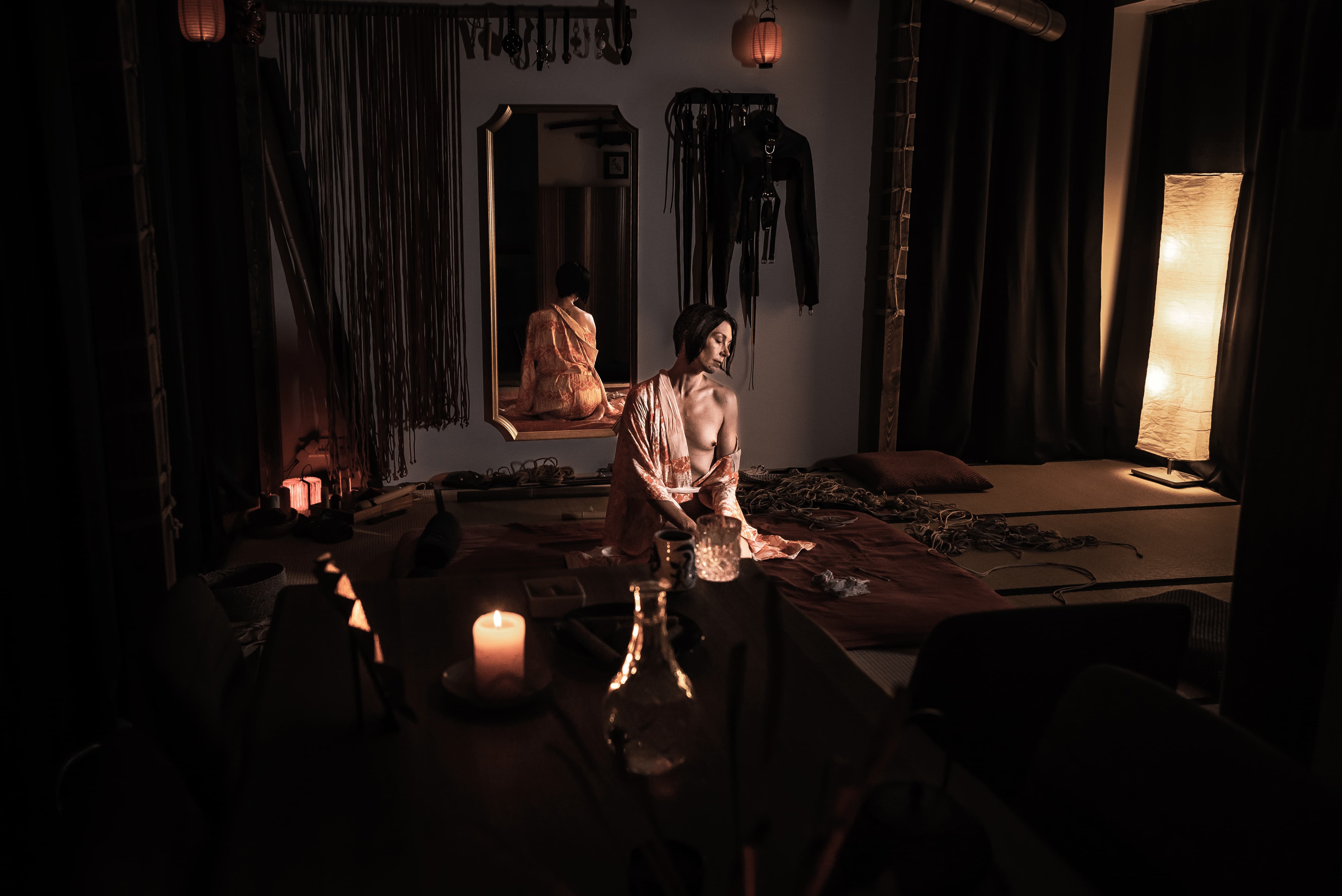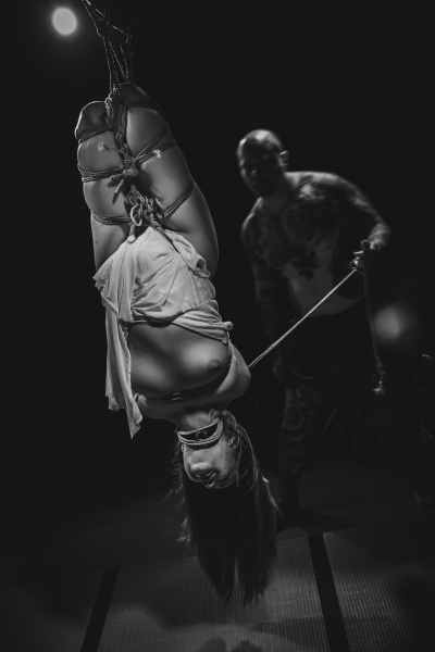 Koe shibarin ja kinbakun vangitseva kauneus intiimissä esityksessä.